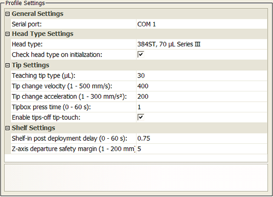 Specifies the pipette head for the active profile. The type should match the head mounted on the Vertical Pipetting Station when the profile is in use.To change the pipette head that is mounted on the Vertical Pipetting Station, see Changing the pipette head. Verifies that the pipette head specified in the profile matches the head mounted on the Vertical Pipetting Station when the profile is used by a protocol.If this check box is cleared, the Vertical Pipetting Station will run with any pipette head installed. Therefore, if you select a 96-channel head type while a 384-channel head is installed, the head will crash.
