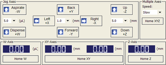 Displays 0.00 when the pipette head is in the w-axis home position.Displays the distance (µL) from the w-axis home position when the pipette head is not in the home position. Displays 0.00 when the pipette head is in the xy-axis home position.Displays the distance (mm) from the x-axis (left) and y-axis (right) home position when the pipette head is not in the home position. Displays 0.00 when the pipette head is in the z-axis home position.Displays the distance (mm) from the z-axis home position when the pipette head is not in the home position.