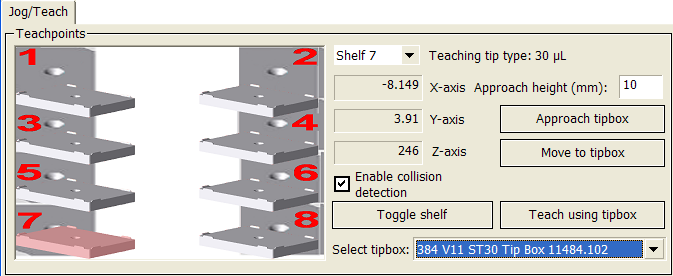 Note: For 30 µL or smaller volume ST tips, the z-axis value is a theoretical value for the shelf 7 and 8 teachpoints. The software calculates the theoretical z-axis value from the location of the pipette head when the teach tipbox button is activated and the tipbox labware definition. Disposable-tip heads only. Specifies the tip size to use when setting the shelf teachpoints. Saves the teachpoint coordinates for the shelf. The Vertical Pipetting Station teachpoints are stored in the Microsoft Windows registry. Disposable-tip heads only. When you select shelf 7 or 8, the Approach, Move, and Teach buttons change to reflect teaching with a tipbox. Saves the tipbox teachpoint coordinates for shelf 7 or 8. The Vertical Pipetting Station teachpoints are stored in the Microsoft Windows registry.