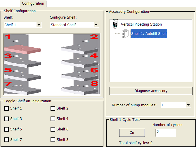 Shows icons for the Vertical Pipetting Station and the accessories associated with specific shelves. Available only if the selected profile is initialized. Displays the Accessory Diagnostics dialog box for the selected accessory. Specifies the total number of Pump Modules for the given Vertical Pipetting Station.