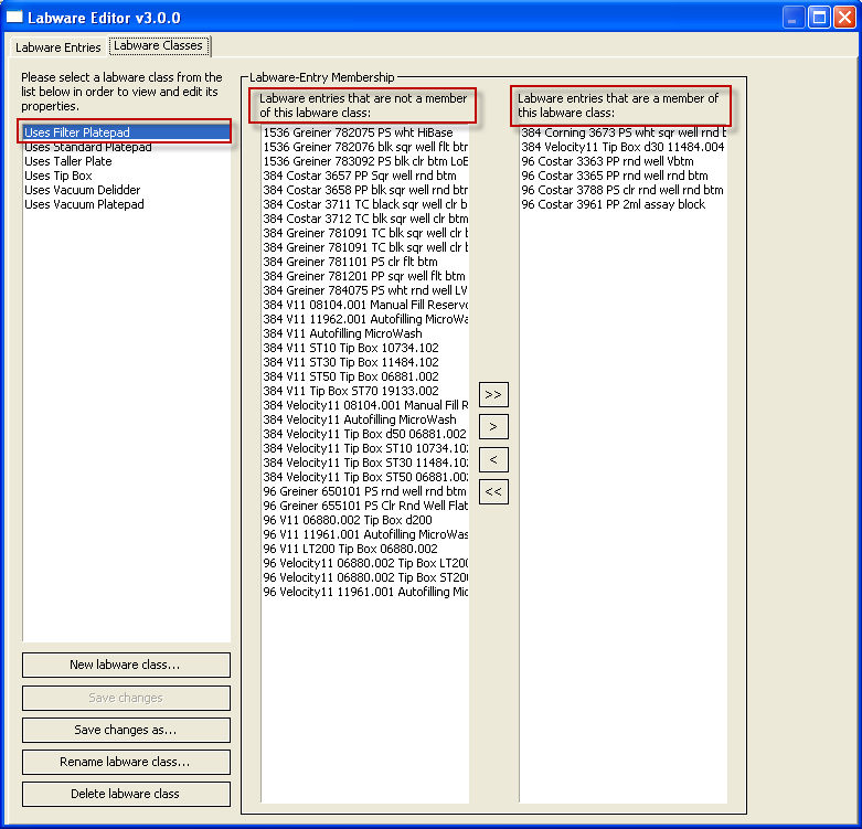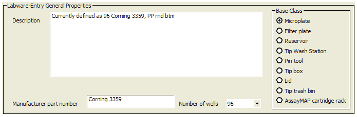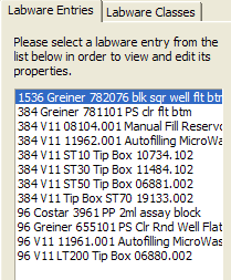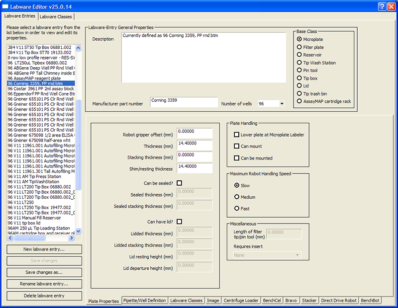 Labware Editor overview Labware Editor tabs The Labware Editor has two tabbed pages: • Labware Entries. Provides tools for creating and editing labware definitions • Labware Classes. Provides tools for creating and editing labware classes and the labware entries for each class. Labware Entries tab Sub-tabs The Labware Entries tab contains the following sub-tabs that contain the properties associated with a labware entry. To find out more about… See… Plate Properties tab Setting microplate properties Pipette/Well Definition tab Setting tip and well properties for pipetting Labware Classes tab Using labware classes example Image tab Adding a labware image Centrifuge Loader tab Setting Centrifuge Loader properties BenchCel tab Setting BenchCel Microplate Handler properties Bravo tab Setting Bravo Platform properties Stacker tab Setting Stacker properties Direct Drive Robot tab Setting Direct Drive Robot properties BenchBot tab Setting BenchBot properties Labware selection list The labware selection list, which is the left-hand column, displays the list of labware definitions and allows you to select the labware entry that you want to edit. Labware-Entry General Properties area The Labware-Entry General Properties area displays the labware properties that apply across all sub-tabs. Labware Classes tab You use the Labware Classes tab to create labware classes and assign defined labware to a labware class. Related information For information about... See... The Labware Editor About defining labware with the Labware Editor Workflow for defining labware in the Labware Editor Workflow for defining labware