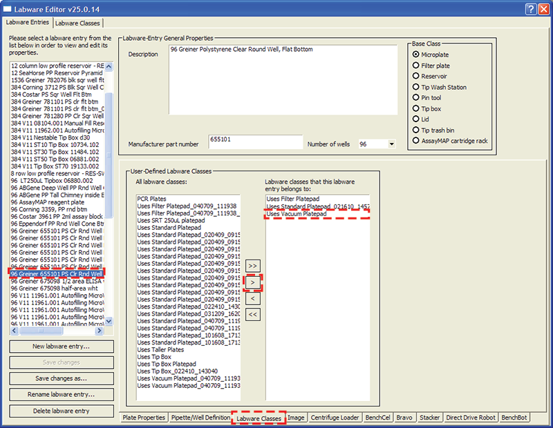 2 In the Labware Entries tab, select the labware from the list, and then click the Labware Classes sub-tab. The classes that the labware are and are not a member of is displayed.