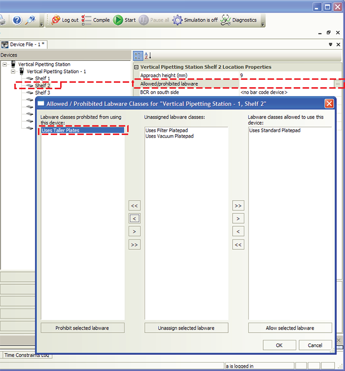 4 In the Unassigned labware classes area, select Uses Taller Plates, and then click < to move it to the Labware classes prohibited from using this device area.