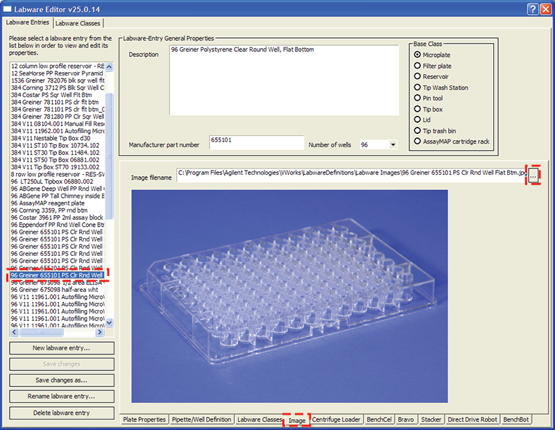 Adding a labware image About labware images To make it easier for operators to identify a labware type, you can insert an image of it in the Labware Editor. Before you start Make sure the image file you want to add is either the JPG, GIF, or BMP format. Procedure To insert an image: 1 Open the Labware Editor. 2 In the Labware Entries tab, select the labware in the left column, and then click the Image sub-tab. 3 At the Image filename box, click the button to locate the file. 4 In the Open dialog box, select the image file and click Open. The image appears below the file name. 5 Click Save changes. Related information For information about... See... Opening the Labware Editor Opening the Labware Editor Workflow for adding labware to the Labware Editor Workflow for defining labware Using the Labware Editor Labware Editor overview