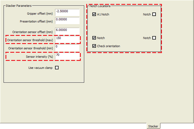 2 BenchCel Microplate Handler only. Set only the maximum orientation sensor threshold, sensor intensity, and notch locations. The other settings are used by the Stacker.