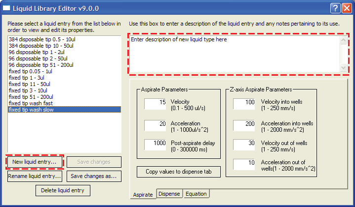 4 Optional. In the box at the top right of the Liquid Library Editor window, type a note describing the entry for your records.