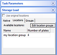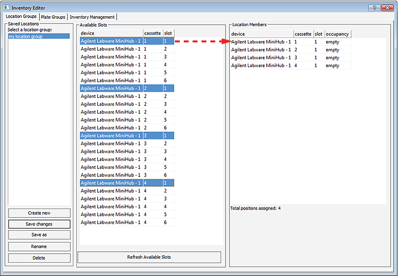 4 In the Available Slots area, select a group of slots and drag the selection into the Location Members area.Note: The slots do not have to be adjacent to each other. For example, is you have different height shelves in the Labware MiniHub, you might want the location group to define the same shelf (slots) in all four cassettes.