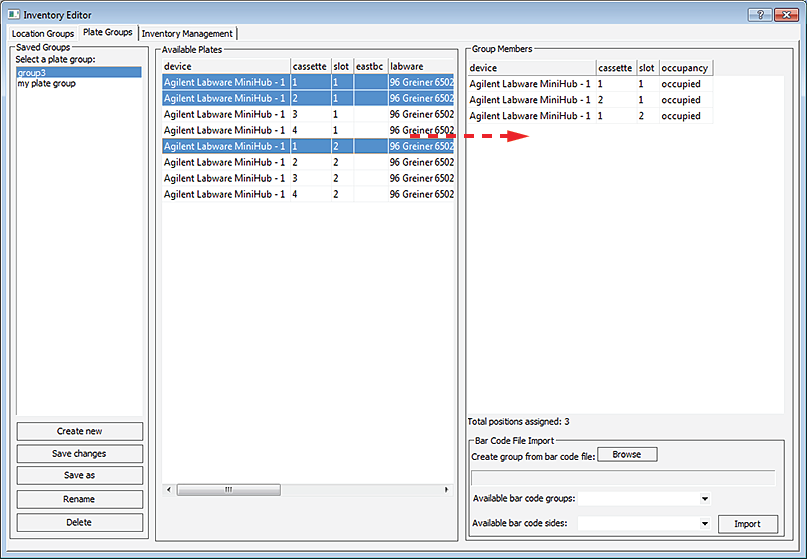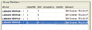 1 In the Available Plates area, select a group of available labware, and drag the selection into the Group Members area.