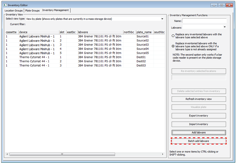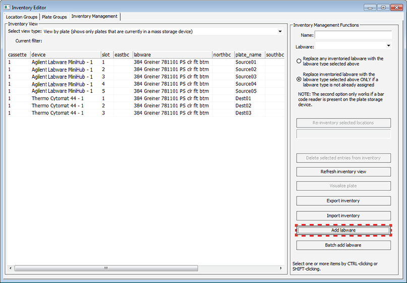 You can also use the plateDB and InventoryLabware JavaScript functions to add labware information in the database. For more information, see plateDB object and InventoryLabware object.
