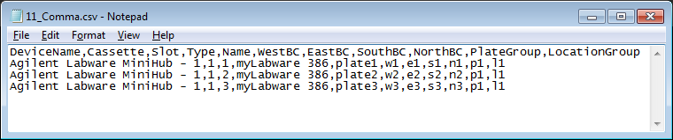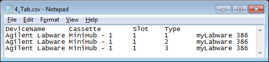 Required column. The name of the device in which the labware resides. Required column. The cassette in which the labware resides. Required column. The slot in which the labware resides. Required column. The type of labware.