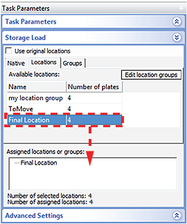 9 Select the Load task, and in the Protocol Task Parameters area drag the location group in the second device to the Assigned locations area.