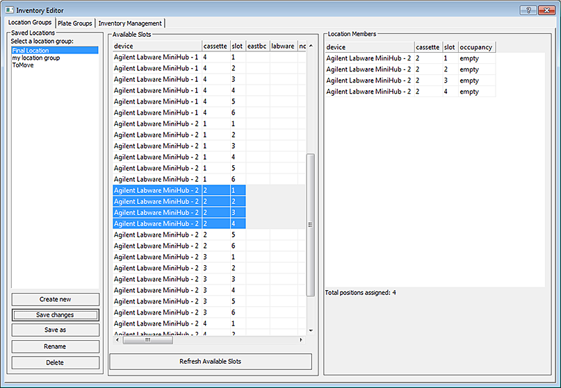 5 In the Inventory Management tab, note the device, cassette, and slot numbers for the destination slots.In this example, the microplates will be moved to MiniHub2, cassette 2, slots 1 to 4.