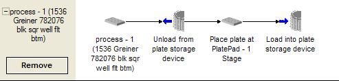Read this topic if your lab automation system has incubators and random-access storage devices such as the Labware MiniHub.In this example procedure, a group of four microplates is moved from one storage device (Labware MiniHub1) to another (Labware MiniHub2).