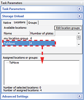 8 Select the Unload task, and in the Task Parameters area, drag the location group in the first device to the Assigned locations area.