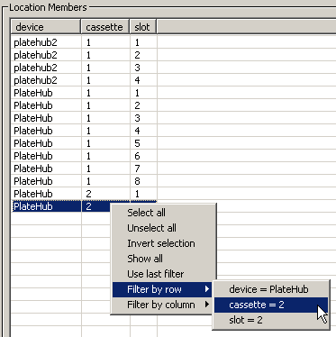 Inventory Editor views and filters About this topic This topic describes how to make the Inventory Editor easier to work with by showing only the items in the Inventory Editor that are relevant at the particular time. Who should read this Read this topic if your lab automation system has incubators and random-access storage devices such as the Labware MiniHub. Inventory Editor views There are three ways to view the labware in the Inventory Editor. To set the view: 1 In the Inventory Editor window, click the Inventory Management tab. 2 In the Select view type list, select one of the following options: View Description View by plate Displays every labware in the inventory. This is the most frequently used view. View by location Displays both labware and slots. View unassigned plates Displays labware that were orphaned during previous runs, or the labware that are in the system but not in a storage device. Filtering displayed labware To simplify your view of the database, you can filter the records that are displayed. To filter the labware records: 1 Right-click a list in any of the tabbed pages of the Inventory Editor and select Show all. 2 Right-click a particular cell and select from the available filtering options. View Description Use last filter Returns the display of items to that displayed when the last filter was applied Filter by row The items that have the same value as the selected item in the row are displayed Filter by column The items that have the same value as the selected item in the column are displayed The items that have the same value as the selected item in the row are displayed. The result is that only those plates in cassette number 2 are listed. To show all labware records: Right-click on the database list and select Show all. Related information For information about... See... Software inventory About labware inventory management Opening the Inventory Editor Opening the Inventory Editor