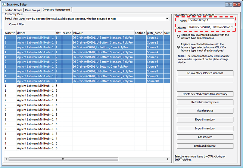 Reinventorying the labware inventory About this topic This topic describes how to use the reinventory feature of labware inventory. This feature can be used to check for mismatches by comparing the identities of the labware actually in a storage device to the labware that the inventory database says should be in the storage device. The reinventory feature can also be used to enter barcode information for labware that have been manually placed into the storage device. Note: Reinventorying requires that the storage device has a barcode reader. Who should read this Read this topic if your lab automation system has a storage device that includes an optional barcode reader. About performing an inventory The accuracy of the inventory database can be checked by performing a new inventory of the database. You can perform an inventory of the entire storage device or part of it. The device’s barcode reader checks all selected slots for the presence of a barcode and reads those that it finds. The results are checked against the inventory database. IMPORTANT For reinventorying to be successful, each labware must have a unique barcode. Reinventorying logic If a labware is found in a slot that, according to the inventory database, should be empty, a line is added to the Inventory Editor for that slot and the labware barcode is recorded. If that barcode is already associated with another slot in the database, the previous association is deleted. In doing this, the system assumes that the labware has been manually moved. If the inventory has a line for a labware in a particular slot, but the inventory finds no labware in that slot, the line is removed from the inventory. However, the data in the system that is associated with the labware is not deleted. If in the future, a labware with an identical barcode is returned to the system, when the next inventory is performed the data can be reassociated with it. Procedure To reinventory the storage device: 1 In the Inventory Editor window, click the Inventory Management tab. 2 From the Select view type list box, select View by location. This lists the labware in the inventory database by location. 3 Select the labware that you want to inventory. You can use SHIFT+click to select a range of listed labware. 4 Under Inventory Management Functions, type the Name of the location group. 5 In the Labware list, select the type of labware. 6 Select one of the following options. Option Comments Replace any inventoried labware with the labware selected above Labware for all selected items are replaced with the labware displayed in the list box. This overwrites labware already assigned. Replace inventoried labware with the labware selected above ONLY if a labware is not already assigned Labware for all selected items that do not already have a labware entry are replaced with the indicated labware. 7 Click Reinventory selected locations. A barcode reader reads each labware in the storage device and adds the barcode data to the inventory database. Related information For information about... See... Inventory groups, plate groups and location groups About inventory groups Moving labware in and out of a storage device • Adding labware information in the inventory database • Removing labware information from the inventory database • Moving labware between storage devices Changing the labware associated with labware record in the inventory database Reinventorying the labware inventory