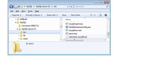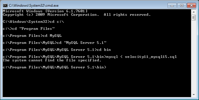 cd c:\ <press ENTER>cd Program <press TAB>cd MySQL <press ENTER>cd MySQL <press TAB>cd bin <press ENTER>mysql < velocity11_mysql5.sql <press ENTER>