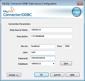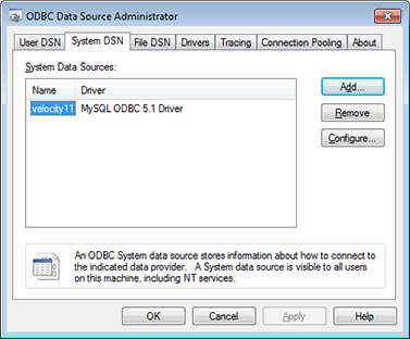 11 In the System DSN tab, verify that velocity11 appears in the System Data Source box, and then click OK.