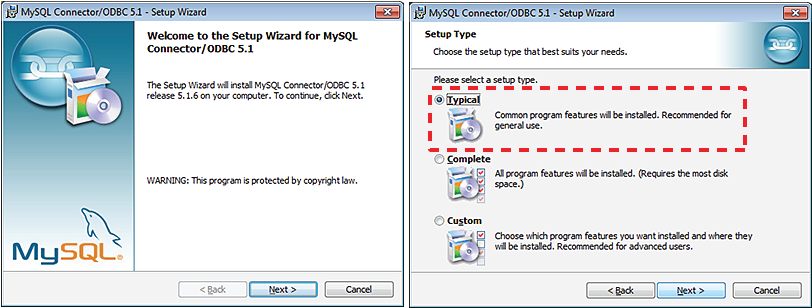 2 When the MySQL Connector/ODBC 5.1 Setup Wizard opens: