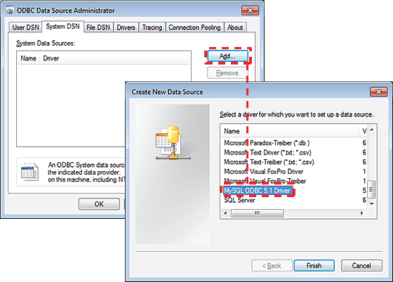 • Click the System DSN tab, select any predefined MySQL ODBC Driver Sources named velocity11, and click Remove.