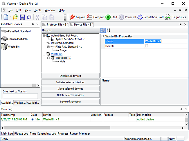 1 In the device file, add the Waste Bin device. See Adding devices for instructions.