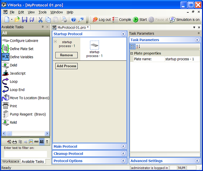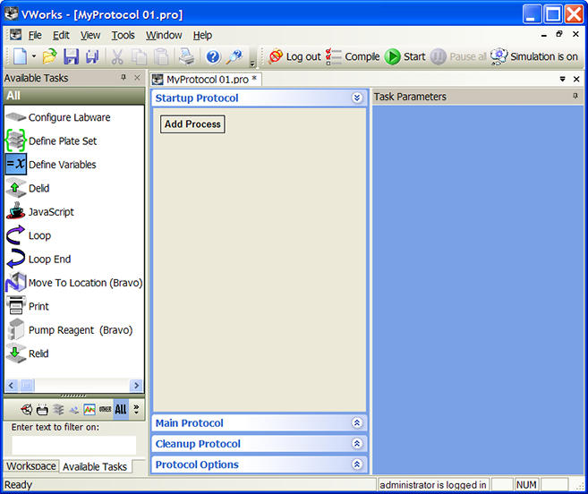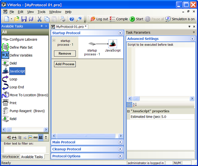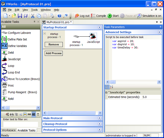 • Startup Protocol JavaScript task. Using the JavaScript task in the Startup Protocol, you can define multiple variables and assign initial values to them. For more information, see Startup Protocol JavaScript task.In the parameter value text box, type the variable assignment and optional code snippet. For syntax requirements, see Variable and snippet syntax.