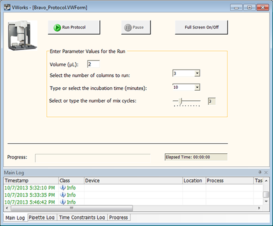 Workflow for creating or editing a form About this topic To create a form, you must have VWorks Technician- or Administrator-level access and an understanding of how to create protocols in the VWorks software. Before you start • Create the protocol (.pro) or runset (.rst) that you want the form to run. • Determine how you want the form to function. For example, will users simply press a run button to start the associated protocol, or will they be required to enter task parameter values before the run? • If the form will include controls that display runtime data for a given task or require a user to enter values, you must have a JavaScript variable associated with the control and the corresponding task parameter. For details on JavaScript variables, see Using simple variables. • Determine whether the form users will require documentation specific to your form. Figure. Example VWorks form in full screen view with logs Workflow Step For this task... See... 1 Open the Form Designer. Opening the Form Designer 2 Select an appropriate button to run the protocol or runset. Configuring a run button and other specialized buttons in a form 3 Determine whether to include the Pause and Full Screen on/off buttons (default), and add any other specialized buttons that you want to use. Configuring a run button and other specialized buttons in a form 4 Add indicators for the elapsed time and progress of the protocol or runset that the form is running. Adding indicators for elapsed time and progress to a form 5 Add controls that display or allow editing of the run data. Adding form controls that allow editing or runtime data display 6 Set the form’s parameters and save the form. Setting the form properties Related information For information about... See... Creating or editing a form Workflow for creating or editing a form Creating a basic protocol Creating a protocol: basic procedure Working with JavaScript Creating a protocol: advanced topics JavaScript context and form design Understanding JavaScript context in form design