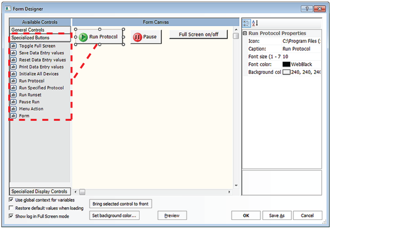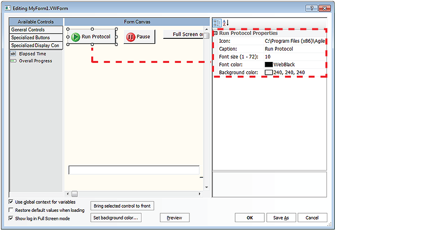 Provides the most flexible way to run a protocol using a form, because you can allow the form users to choose which protocol to run and the number of run times. The Pushbutton control is under the General Controls area. For details on how to configure the Pushbutton control, see Adding form controls that allow editing or runtime data display and Example: Creating a scripted Pushbutton control in a form. Setup requirements. In the Protocol Options area of the VWorks window, you must specify the form to use (.VWForm). You can also choose to automatically load the form file, so that the form opens automatically when the protocol is opened. Setup requirements. The properties for the button must specify the protocol file (.pro) and the number of times to run it. Setup requirements. The properties for button must specify the runset file (.rst), and you must select the Use global context for variables check box for the form.