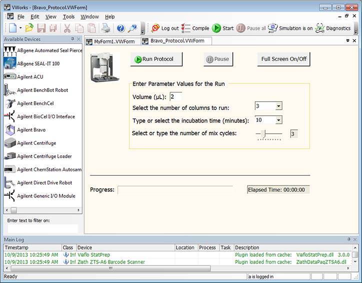 • Full screen on. Displays only the form in the VWorks window. Optionally, the view can include the Main Log, Pipette Log, Time Constraints Log, and Progress tabs. All other controls and areas, such as menus, toolbars, and the work area are hidden.