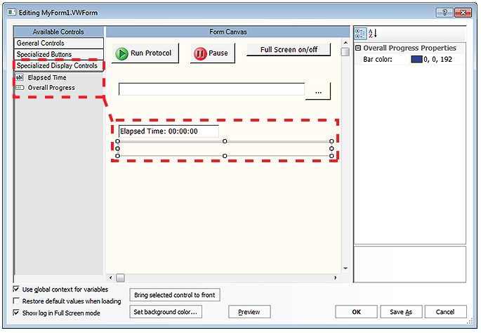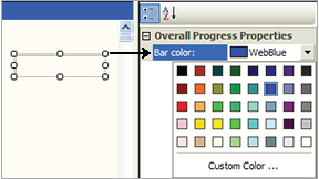 Click the color in the palette list, or click Custom Color to open the Select Color dialog box and create a custom color.Note: To create a caption for the Overall Progress control, you can combine the Overall Progress control with the Static text control. See About the General Controls.Note: To have one control overlap another control on the form, select the control that you want on top, and then click Bring selected control to front.