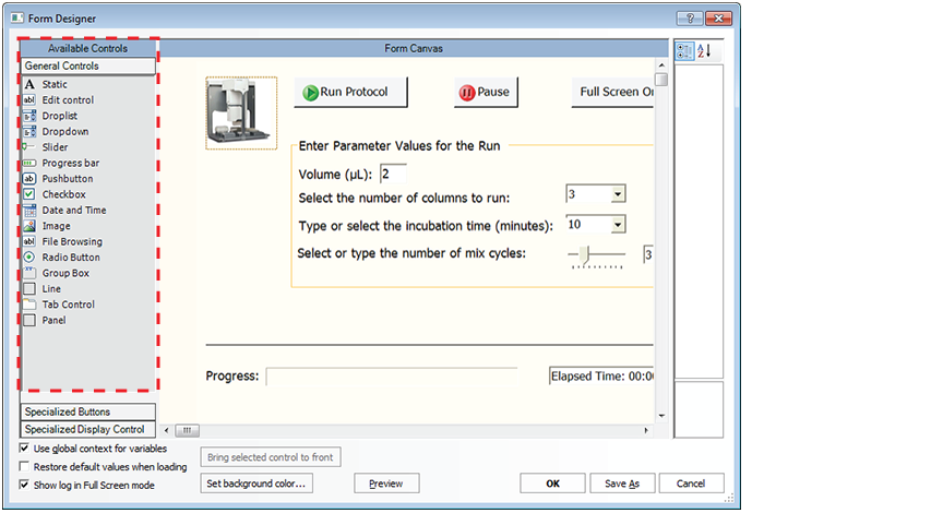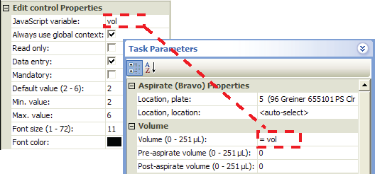 For example, if you want the form’s user to enter the aspirate volume for a given task, you could use an Edit control that has a JavaScript variable of vol. In the protocol, you would specify the Aspirate Properties for Volume as = vol. If the form’s Use global context for variables check box is selected, you can ignore this setting. If the form’s Use global context for variables check box is not selected, specify which context to use for the control’s JavaScript variable: