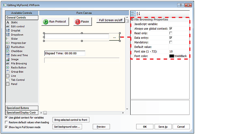 For an example of how to set up a File Browsing control, see Example: Creating a scripted Pushbutton control in a form.