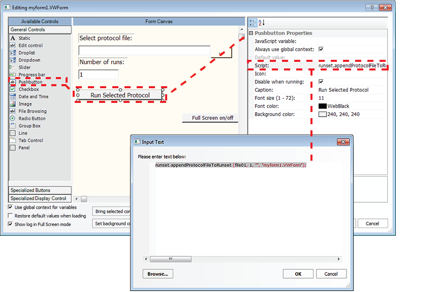• Global context. Select the check box to use the global context. For example, if the button is to be pressed while no protocol is running, you must use the global context.IMPORTANT Any protocol that uses the global context and contains JavaScript variables of the same name will be affected by changes you make to this variable, even if this form’s Use global context for variables check box is not selected.