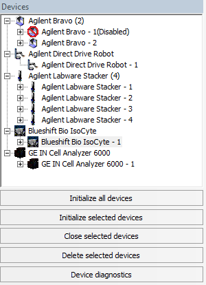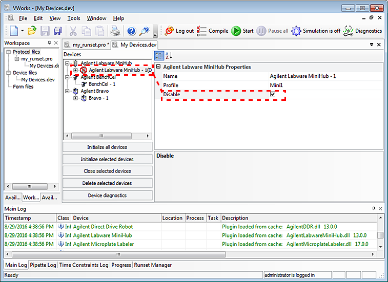3 Clear the Disable check box under the device properties area. Alternatively, right-click the device name and select Enable device.For example, you might want to run two protocols that use a Bravo Platform but each one requires a different pipette head. One protocol uses 96-well microplates and the other 384-well microplates. Instead of having two device files, each with a unique Bravo Platform profile for a specific head, you can create one device file in which you add two Bravo Platform devices, each with a unique profile and setup. When running one of the protocols, the Bravo Platform device with the configuration that is not in use is disabled.