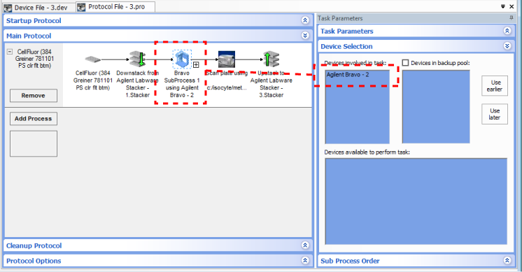 6 In the protocol, ensure the Bravo subprocess is associated with the correct Bravo device. See SubProcess (Bravo, Vertical Pipetting Station) for instructions.