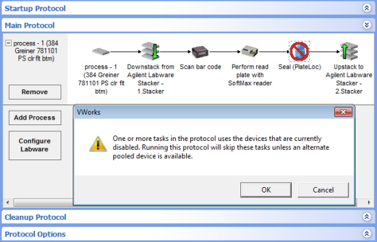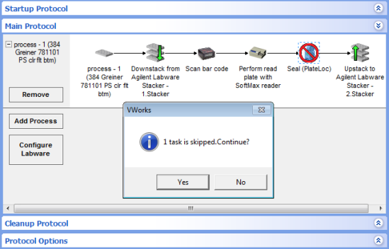 6 Click Yes to confirm the number. The Run Configuration Wizard opens. Follow the instructions in the wizard. For details on the wizard, see Starting the protocol run. During the run, the tasks associated with the disabled device are skipped. In the preceding example, the Seal task is skipped because the PlateLoc Sealer device is disabled.While performing maintenance on a PlateLoc Sealer that is a member of a pool of PlateLoc Sealers, you want to continue to run a protocol using the other devices.