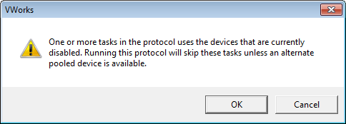 7 When you are ready to run the protocol, click Start. A disabled device message appears and asks you to confirm that you want to skip the disabled tasks.