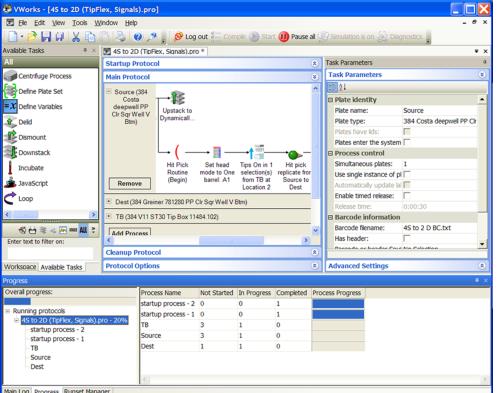 Monitoring the overall run progress Procedure To check the overall run progress: In the VWorks window, select View > Progress. The Progress tab appears at the bottom of the window and displays the following: Area or table Description Overall progress Displays a progress bar to indicate how far along the system is in all running protocols. Running protocols Contains the list of protocols that are currently running. You can select a protocol name to display the progress of all processes in the protocol, or you can select a specific process and display its progress. Display Based on your selection in the Overall progress area, shows an aspect of the overall run progress. Related information For information about... See... Tracking run progress of instances, processes, or devices Tracking the run progress of instances or devices Pausing the run Pausing the run Stopping the run Stopping the run