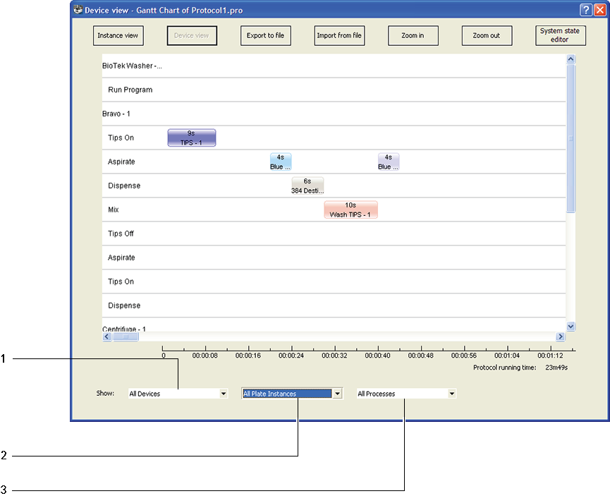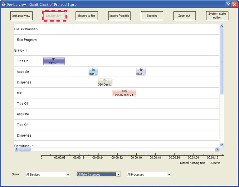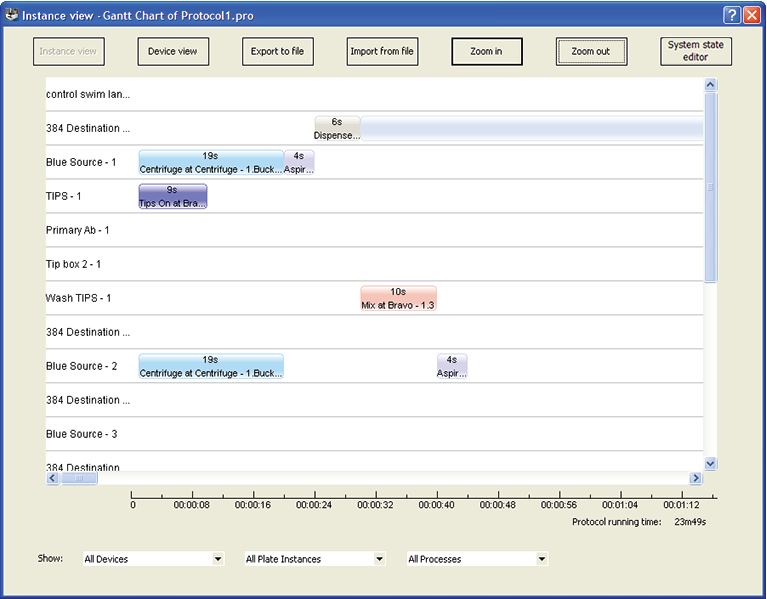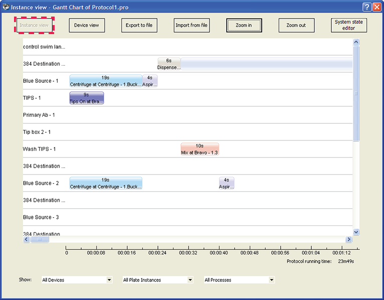 You can display a Gantt chart for one or more protocols while they are running, or for one or more open protocols have been run in the current VWorks session since they were opened.