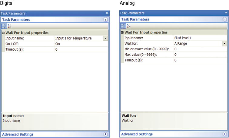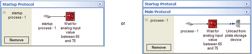 The Wait for Input task () requires that one or more conditions to be met before starting the next task in the protocol. For example, you can require that the system environment reach a certain temperature and humidity before the Main Protocol starts.