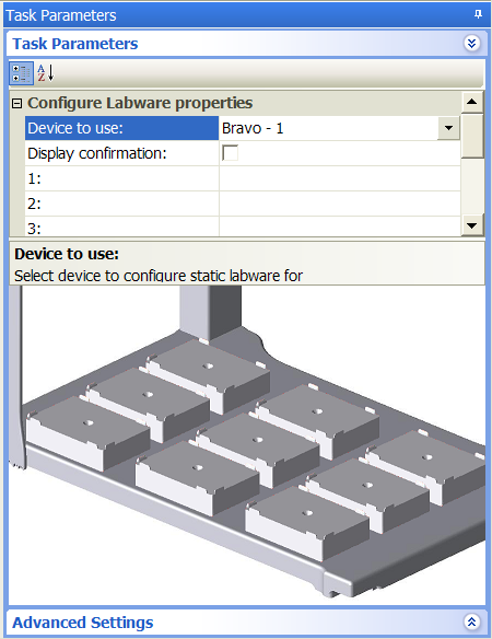IMPORTANT Although the VWorks software supports the static labware configuration in protocols, Agilent Technologies recommends that you use the concept and procedure in Configuring labware when writing new protocols.Available only in the Startup protocol, the Configure Labware task () allows you to assign static labware to locations on a device. The labware will remain at these locations during the protocol.