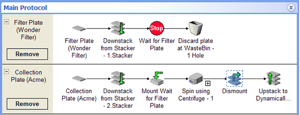 ) removes labware, such as a filter microplate, from the top of an elution microplate or reservoir that is resting on a platepad. Always paired with a Mount task, the Dismount task uses information that is specified in the Mount task.