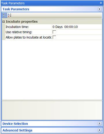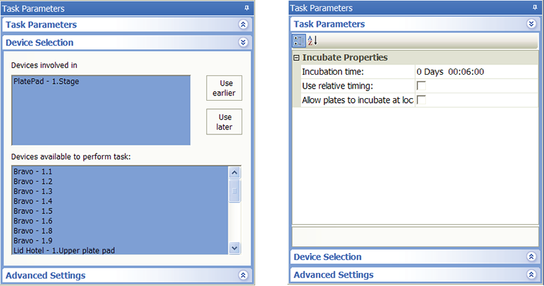 Select this option to prevent bottlenecking at a downstream device. Alternatively, use the Release time parameter when setting process plate properties. You must select a device for Incubate tasks. If you have multiple devices of the same type, you can:After adding the Incubate task at the desired point in the protocol, select the task, and then click Device Selection in the Task Parameters area.