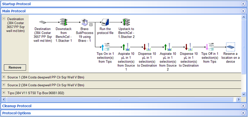 <auto-select> automatically places the labware at the first-available or appropriate location for the task. If accessories are installed on the deck or shelf, the software uses the accessory configuration information in Bravo Diagnostics to determine the correct location for the task. Aspirate contents from two source microplates and dispense into a destination microplate. Incubate the destination microplate at Bravo deck location 5 for 2 minutes before reading the microplate.