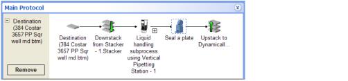 Downstack microplates from a stacking device for liquid-handling tasks on the Vertical Pipetting Station, seal them, and then upstack them to any available stacker.Add a Seal (PlateLoc) task after the Vertical Pipetting Station Subprocess.