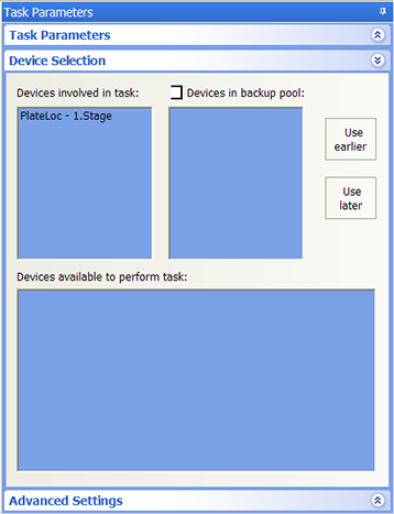 2 To prioritize its use, select the device in the Devices involved in task area, and then click User earlier or Use later. The devices that are higher in the list are favored by the software scheduler during the protocol run.
