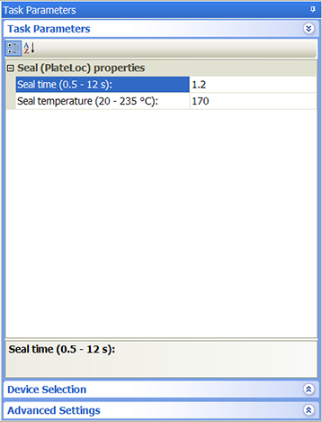 You must select a device for Seal (PlateLoc) tasks. If you have multiple devices of the same type, you can:After adding the Seal (PlateLoc) task at the desired point in the protocol, select the task, and then click Device Selection in the Task Parameters area.