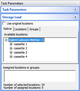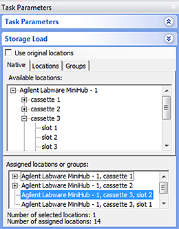 • Native locations. Native locations are known locations in a device file. For example, if the Labware MiniHub is in the device file, you can select a cassette in that carousel for the Load task. When you select a cassette, all 16 slots in the cassette are available for the task. If you have only 10 microplates to load into that cassette, six of the slots will remain empty.
