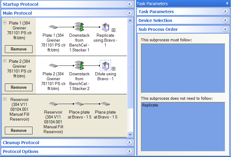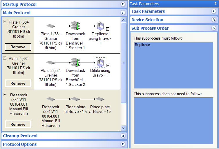To specify the sequence in which the sub-processes will be performed on the same configured labware:In the following example, the Bravo Subprocess named Dilute is selected.