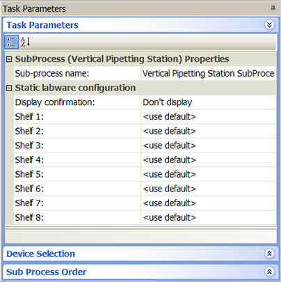 IMPORTANT The latest version of the VWorks software is backward-compatible with protocols created in VWorks4 version 6.2.3 or earlier and will continue to support static labware configuration procedures. However, Agilent Technologies recommends that you use the concepts and procedure in Configuring labware when writing new protocols.After adding the Subprocess task at the desired point in the protocol, you have the option of assigning static labware to locations on a device. You assign static labware in the subprocess to override the static labware configuration in the Startup Protocol. For more information about static labware, see Planning labware use.To assign static labware to locations on the device, set the following parameters in the Task Parameters area: